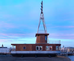 There is a deck, a crow’s nest and a cabinet of visual curios – and a centerpiece bed which slides on rails to make the most of the views over London. Before departure, guests will be invited to fill in a logbook in the ‘bridge’ of the boat, detailing what they have experienced during their stay, out of the window as much as within themselves. An octagonal library with a carefully curated selection of books and twin desks looking out across the river enables visitors to use the Room as a remarkable studio space.