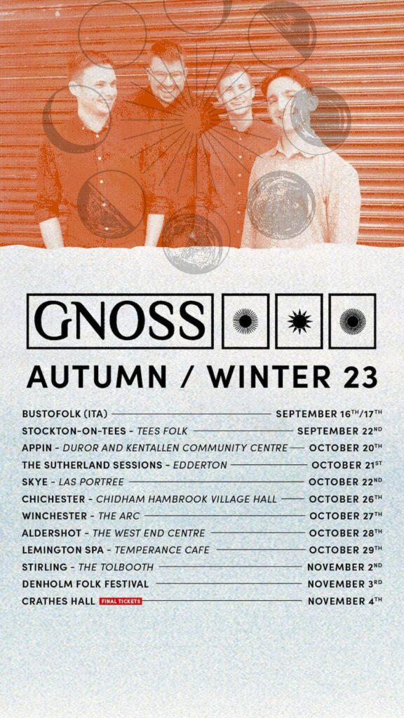 It’s a clever mix of musicianship which make up Gnoss, with founders Orcadian Aidan Moodie on vocals and acoustic guitar, and fellow Orcadian Graham Rorie on fiddle and mandolin. Added to this are Perthshire’s Connor Sinclair on flute and whistles, Clackmannanshire’s Craig Baxter on bodhran and percussion, whilst Breabach’s James Lindsay guests with some electric and double bass. With musical tastes and influences sourced from almost all corners of Scotland, it is a testament to the band’s core identity that they retain a strong sense of their Orkney origins – looking back to the history of their isles and to the wider influence beyond.