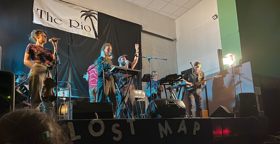 In case we hadn’t heard enough from these two fantastic performers already (disclaimer: we certainly had not!), both returned for the final act, a collaborative project between eight talented musicians. Alongside Lynch and Lief, Weird Waves consists of drummer Iain Stewart, multi-instrumentalist Susan Bear, guitarist and singer Kate Lazda (Kid Canaveral), bassist Bart Owl (eagleowl), violinist Robyn Dawson, and Savage Mansion frontman Craig Angus. Described by The Scotsman as a “supergroup”, what followed was an unexpected and somewhat psychedelic experience, with members merging their unique skills and sounds to incredibly powerful effect. With phenomenal energy and an endearingly visible sense of camaraderie, the octet treated us to the majority of their first LP, Weird Wave (yet another product of 2023, evidently a triumphant post-pandemic year for tonight’s performers). The group recorded the LP on the Isle of Eigg over the course of a week to mark the tenth birthday of Lost Map Records, a milestone which Lynch has described as befitting both a celebration and “an existential crisis”. Although hardcore drumming and metal-esque vocalisations are a far cry from the more traditional Scottish folk scene, it was impossible not to beam and sway (or jump, for those on the dancefloor) along to the likes of “Big Jetty” and “Astral Difficulties/ Weird Wave”, both released as singles in their own right.